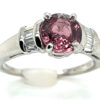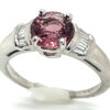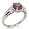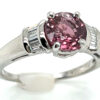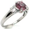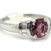 This sapphire caught my eye out of hundreds on display. I have never seen such a beautiful and unusual color on a sapphire. The color is best described as rose with magenta flashes, The certification describes the color as pink, orange and brown. Noted are the two colors found in the Padaparadscha, or lotus colored sapphire, and this sapphire certainly takes on that appearance in certain lighting conditions (more yellow than white light). The sapphire is certified by the American Gem Laboratory A.G.L. as being a natural fancy sapphire that weighs 2.06 carats and measures 7.48 mm. The sapphire has a round brilliant cut, excellent clarity and beautiful brilliance filled with flashes or red, orange, pink, rose, magenta and earth tone brown. Prong set the sapphire rests between baguette cut diamonds that are channel set across the ring’s shoulders and are VS2 GH quality. In total there is 0.40 carats of diamonds and the ring weighs 6.25 grams of platinum and is a size 71/2. Please let us know your size request on the order form.