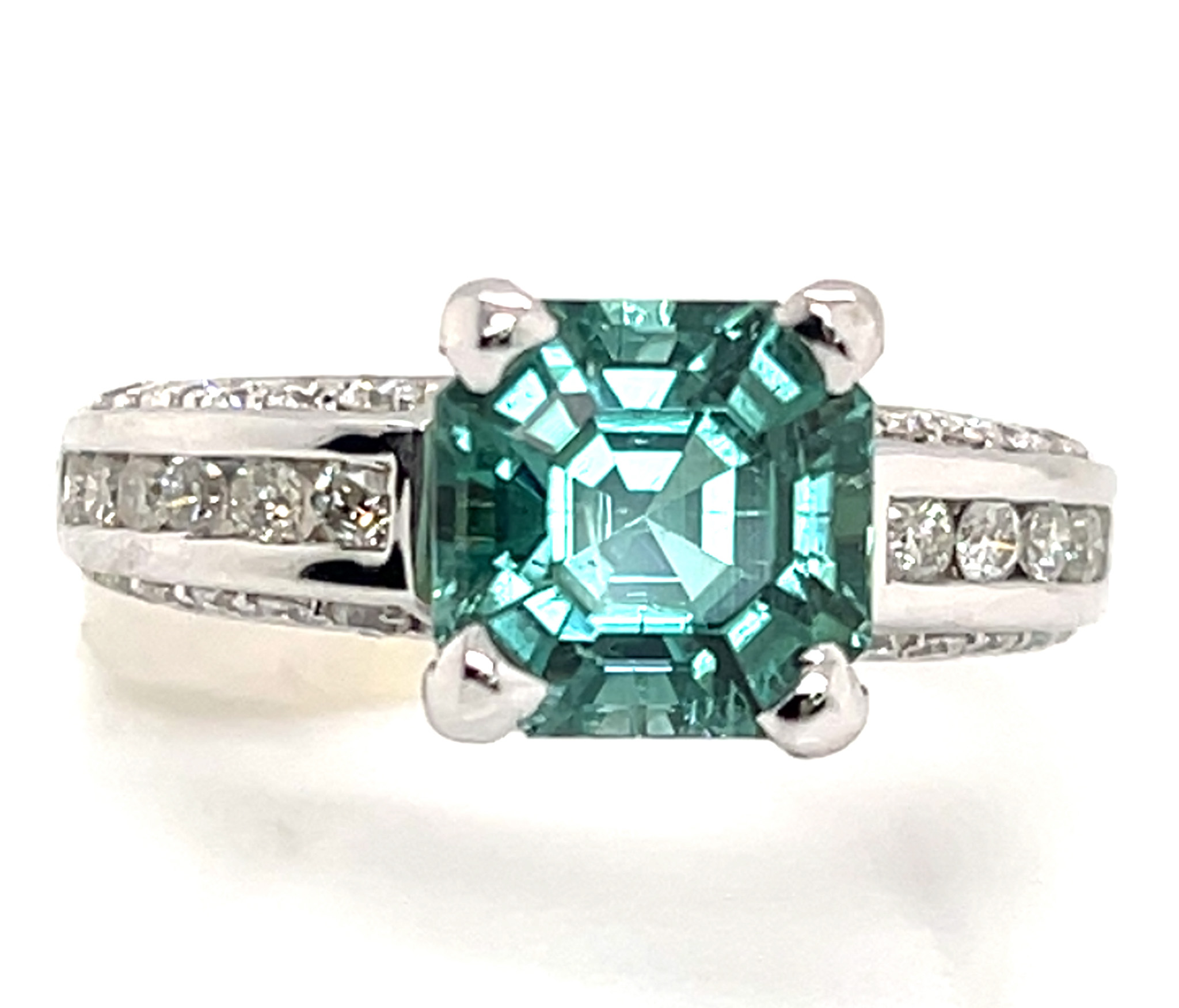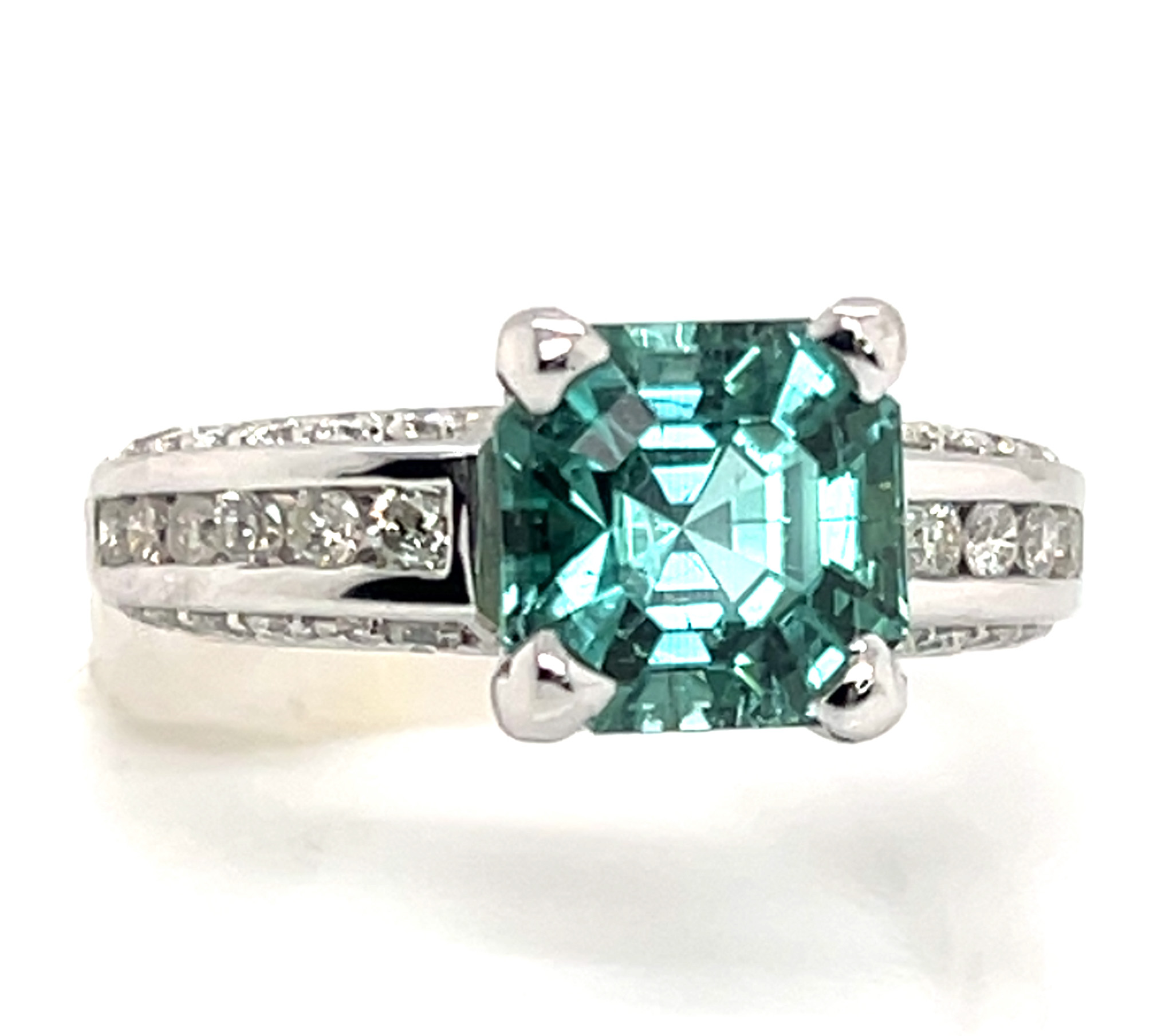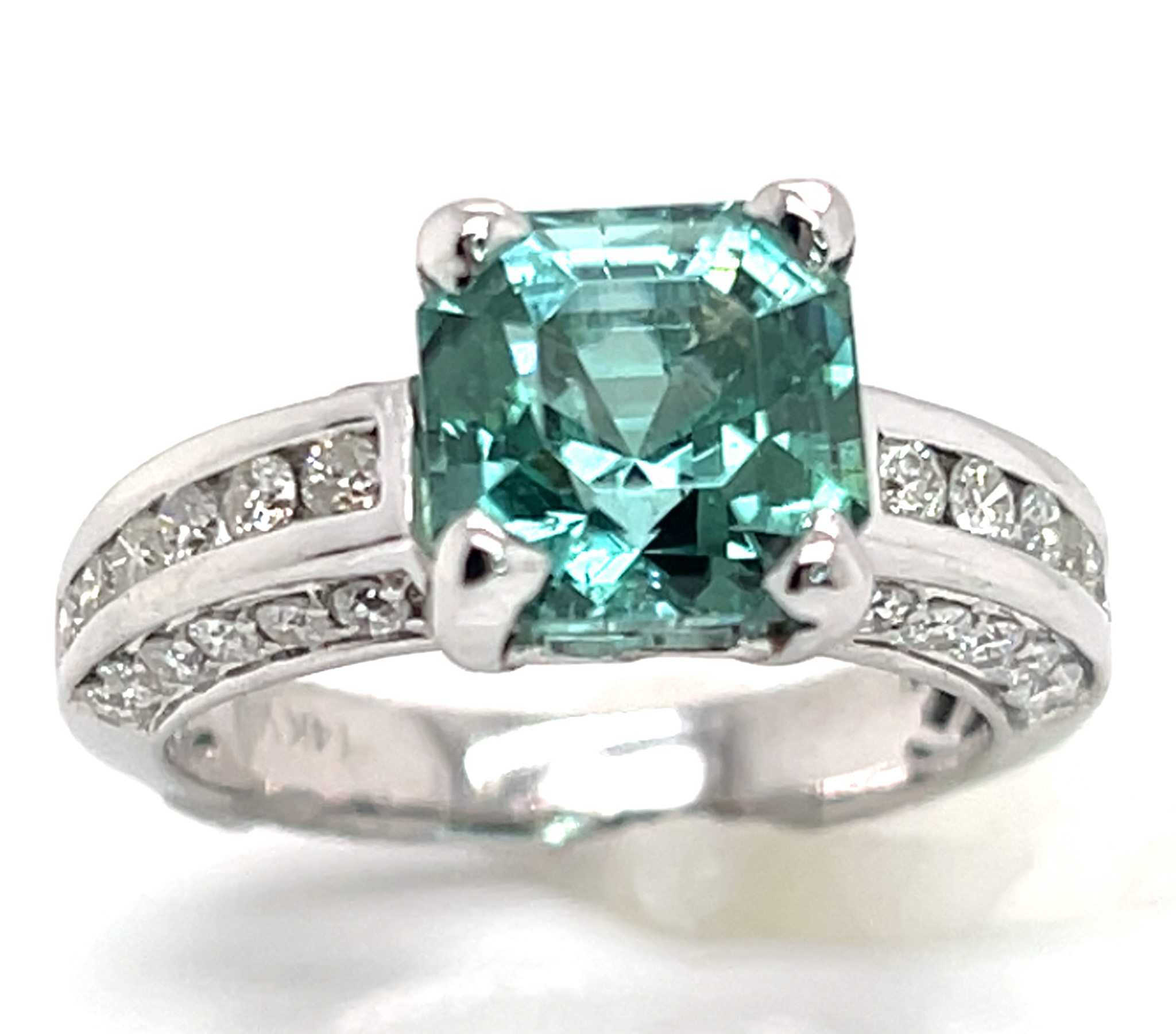 I had this stone custom cut from high quality neon blue green African (Mozambique) tourmaline rough. Jeff White, a top USA factor, is highly skilled at precision cutting asschers. This gorgeous piece of tourmaline has great clarity, superb cut and polish and strong blue to green color. The stone measures 8.41 X 8.41 mm and weighs a large 3.78 ct. It is four prong set in a ring with channel and bead set 1.5 mm round brilliant diamonds along the ring’s gallery and channel set 2.0 mm diamonds along the ring’s shoulders. In total there are 36 diamonds for 0.72 ctw and they are SI1 GH quality. The ring weighs approximately 5.0 grams of 14K white gold and is a size 7. Please indicate your size request on the order form.