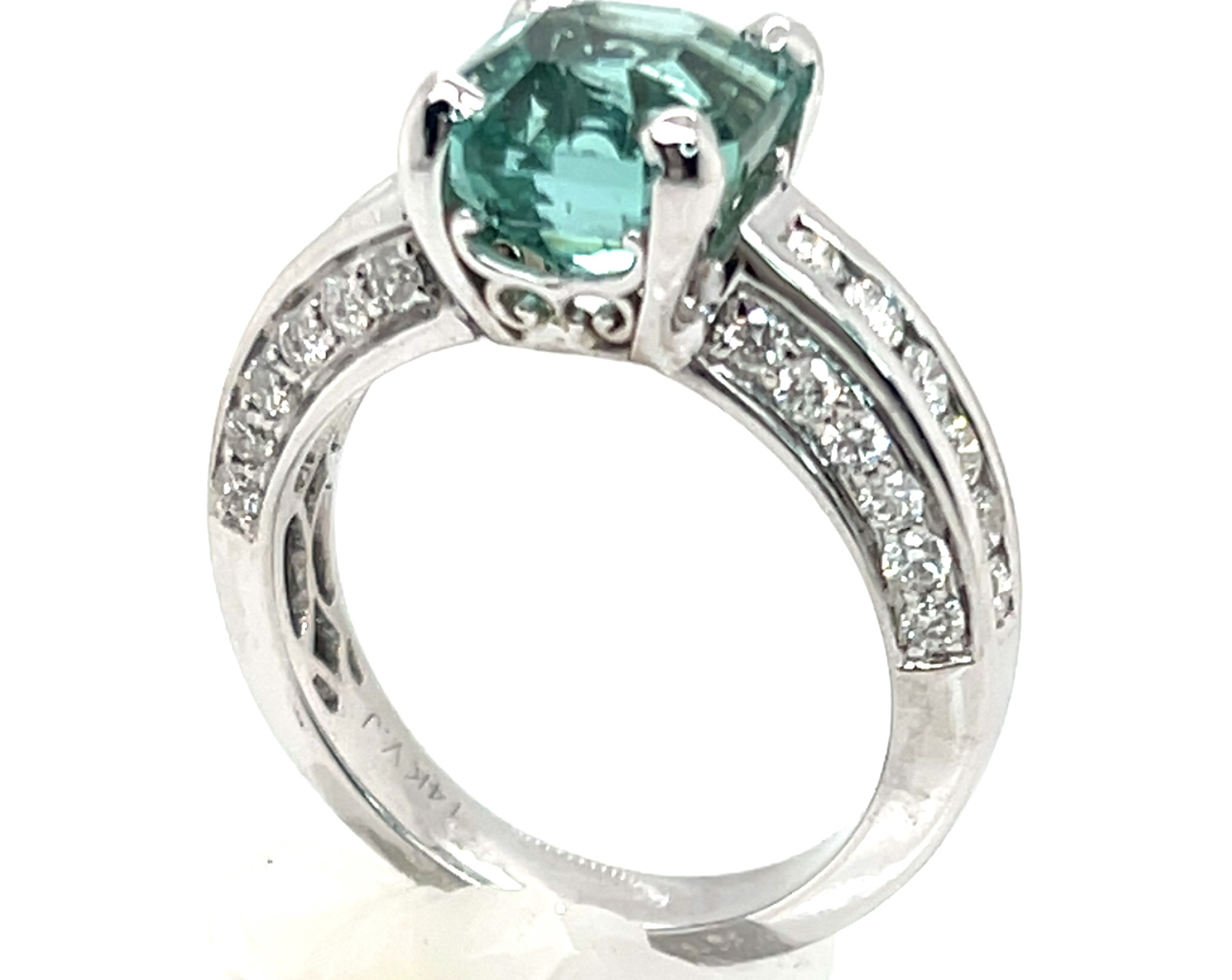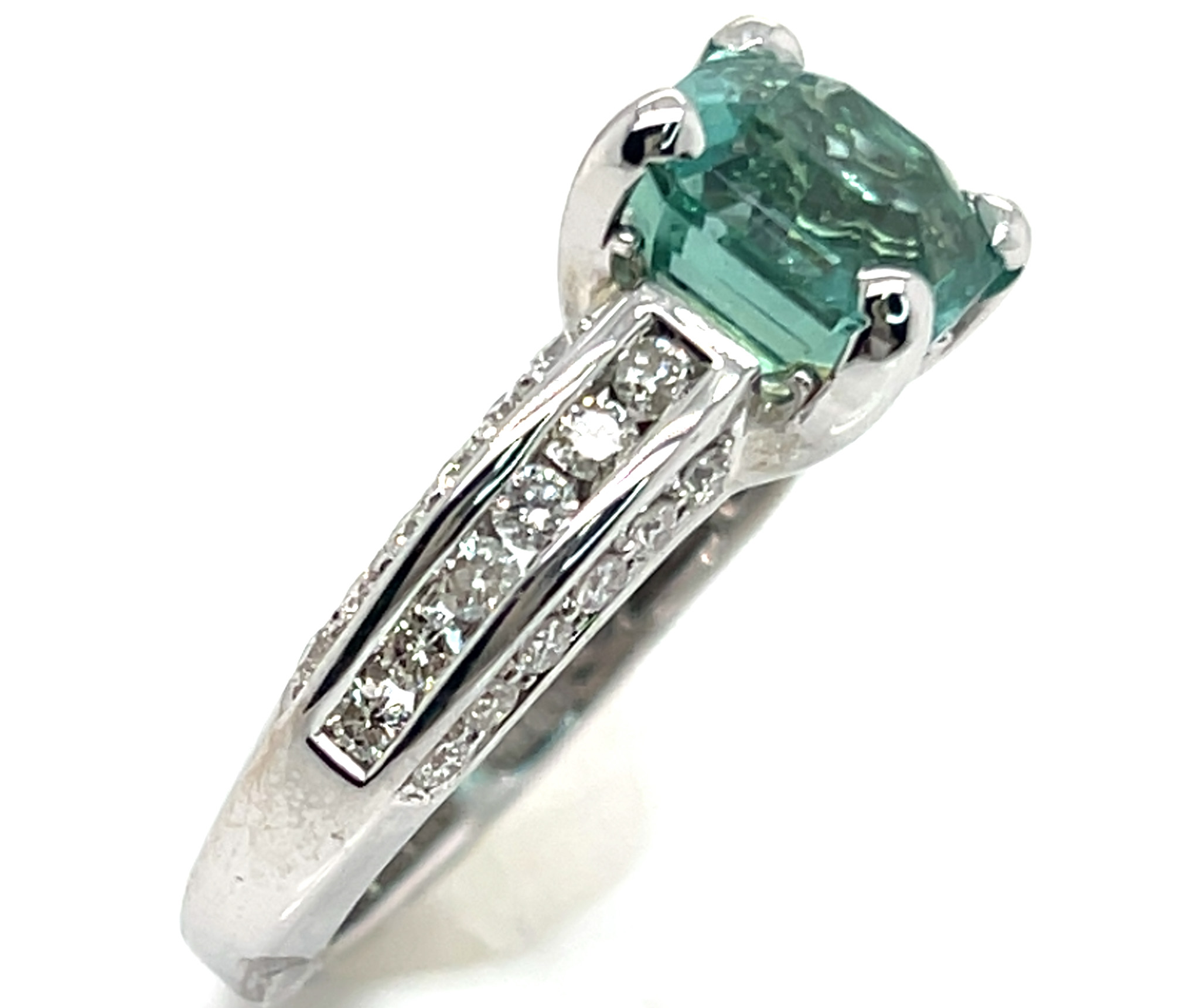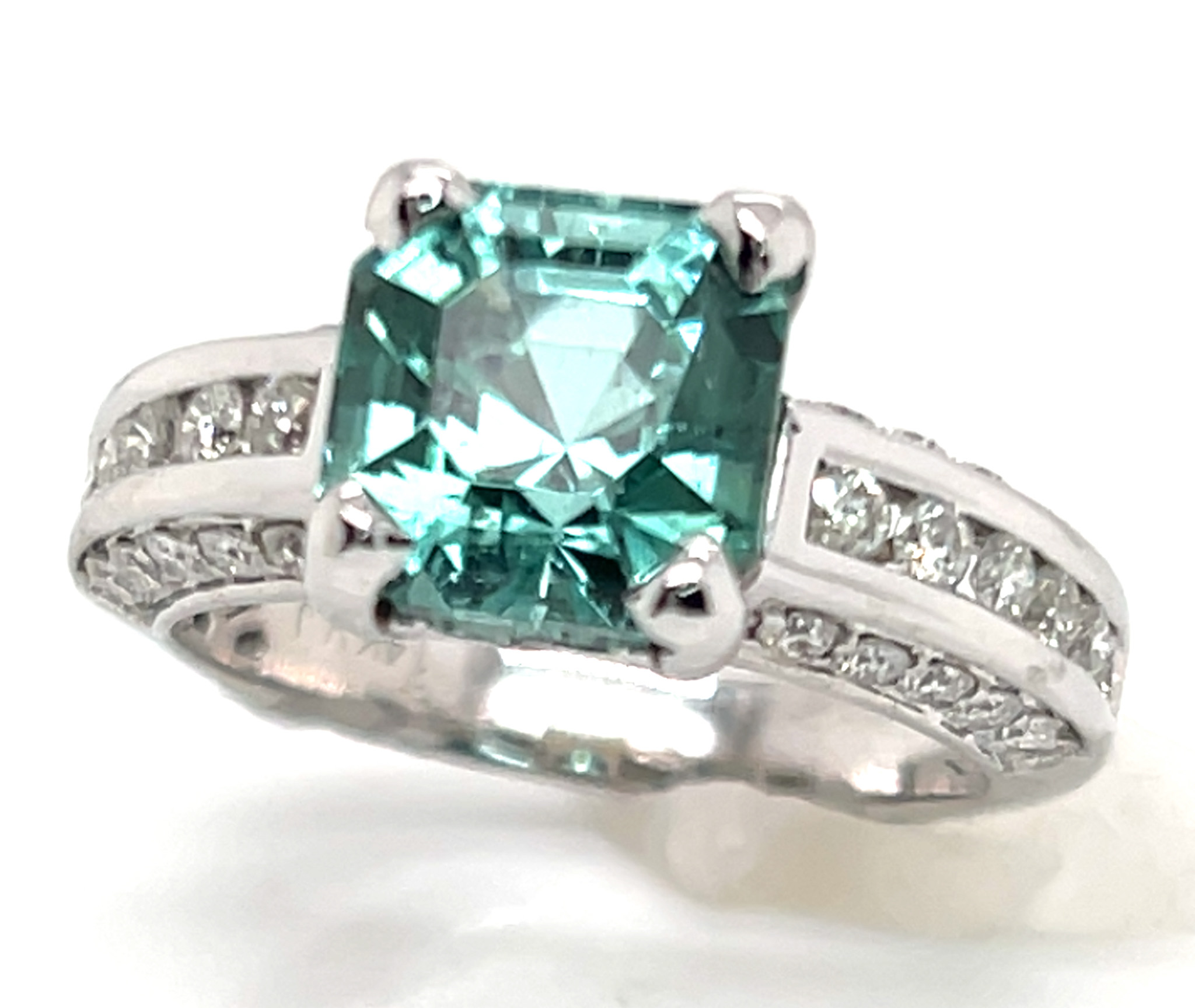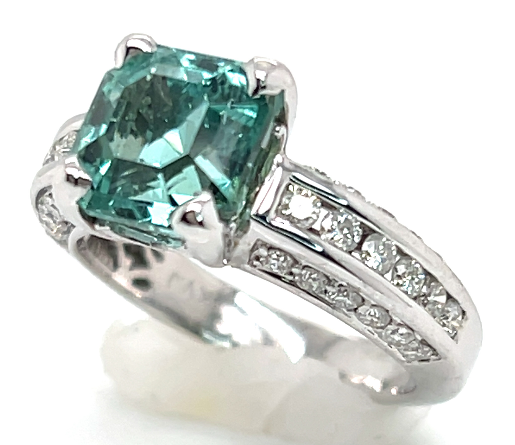 I had this stone custom cut from high quality neon blue green African (Mozambique) tourmaline rough. Jeff White, a top USA factor, is highly skilled at precision cutting asschers. This gorgeous piece of tourmaline has great clarity, superb cut and polish and strong blue to green color. The stone measures 8.41 X 8.41 mm and weighs a large 3.78 ct. It is four prong set in a ring with channel and bead set 1.5 mm round brilliant diamonds along the ring’s gallery and channel set 2.0 mm diamonds along the ring’s shoulders. In total there are 36 diamonds for 0.72 ctw and they are SI1 GH quality. The ring weighs approximately 5.0 grams of 14K white gold and is a size 7. Please indicate your size request on the order form.