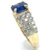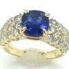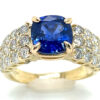 The sapphire measures 8.17 X 8.08 X 4.90 mm and rests between round brilliant diamonds that line the ring’s shoulders, are 1.33 carats total weight and SI2/I1 I grades.