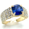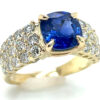 This breathtaking TOP Blue Ceylon Sapphire exhibits the best richly blue saturated color. It also displays excellent clarity which joins with the precision cushion cut to deliver unrivaled electric blue brilliance (as noted in the photos). Prong set the large 2.90 ct sapphire has maximum light exposure and is set in a safe low setting. The sapphire measures 8.17 X 8.08 X 4.90 mm and rests between round brilliant pave set diamonds that line the ring’s shoulders and are 1.33 carats total weight and SI2/I1 I grades. The ring weighs 5.75 grams of 14K yellow gold and is a size 7. Please let us know your size preference in the additional comments section of the order form.