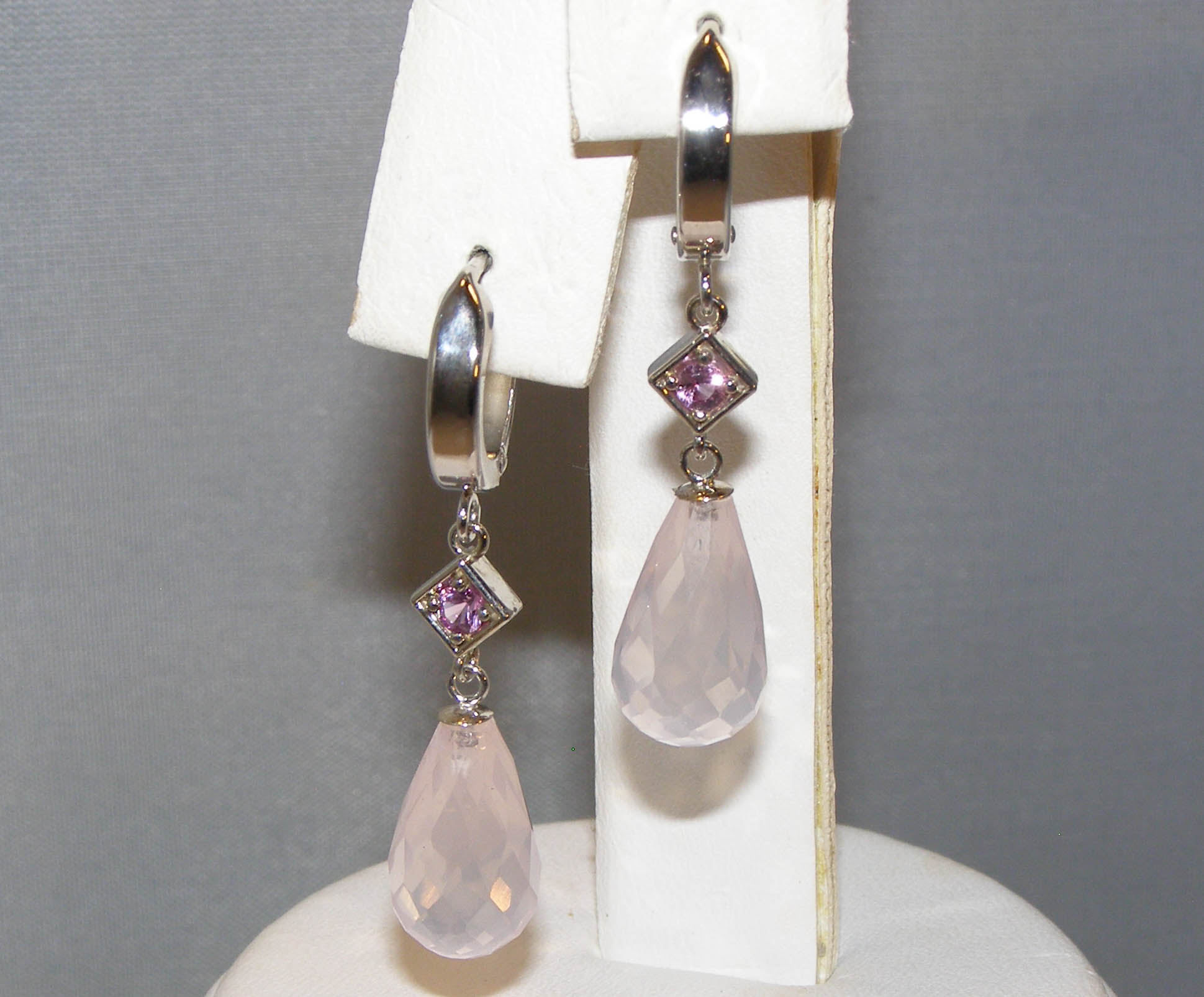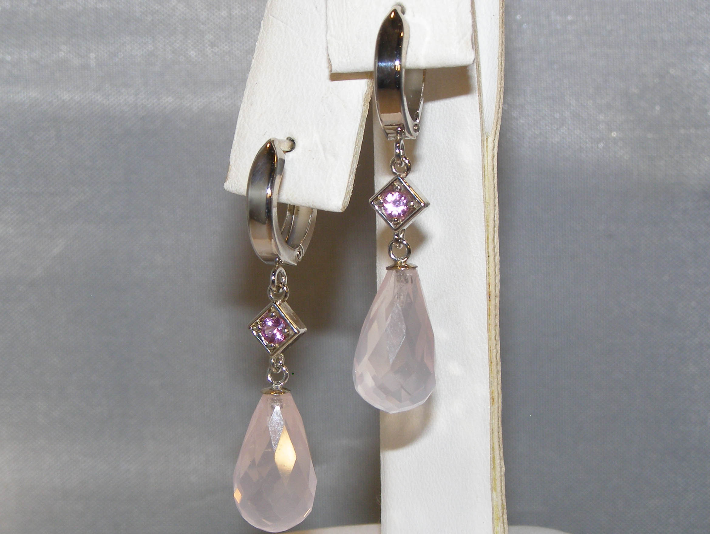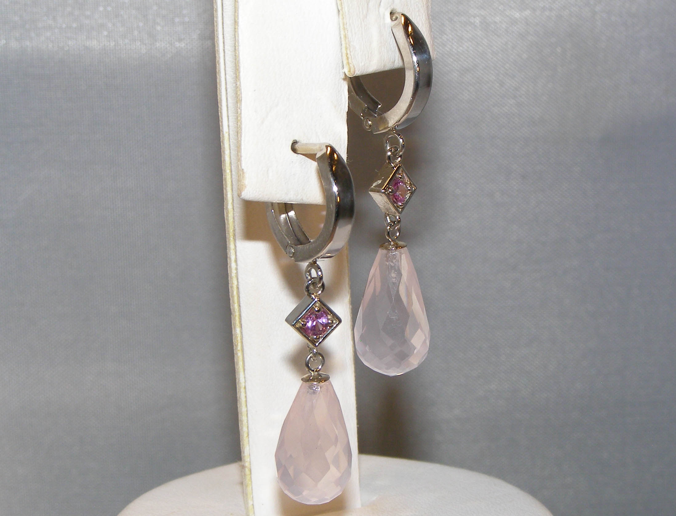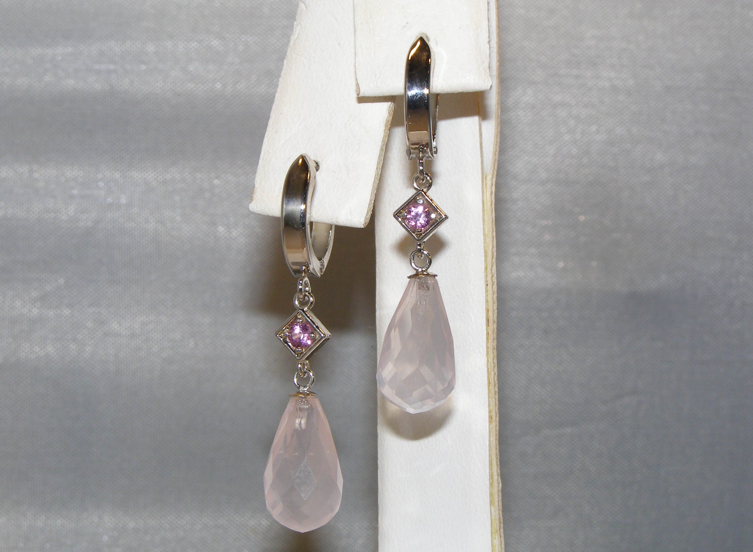 I love the look of these earrings with the soft pink briolettes and pink sapphires. A pair of finely cut briolette pink quartz, that weigh 10.95 ctw, are top drilled and dangle freely to capture light and showcase the pair’s brilliance. The pair have a soft to medium pink color, are clear and have lovely brilliance. Above the briolettes is a pair of round brilliant faceted Ceylon pink sapphires that are 2.30 mm, 0.08 ctw, have bright pink color, excellent clarity and brilliance. The sapphire pair are prong set in square framed settings. The final earring component is a pair of huggie hoops that offer style, balance and wonderful comfort when worn. Although the carat weight is high for the earrings the hoops do an excellent job of weight distribution and they are very comfortable to wear. The 14KWG earrings dangle 11/2″ or 38 mm in length and are 1/3″ or 8.0 mm wide. A great pair to complete a wedding guest outfit or to run out to meet friends.