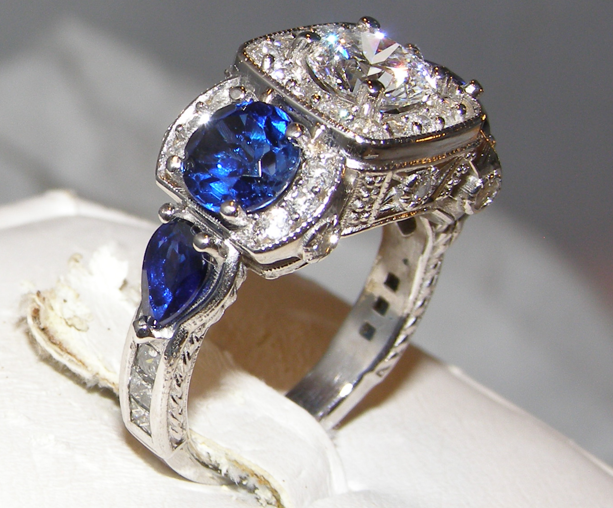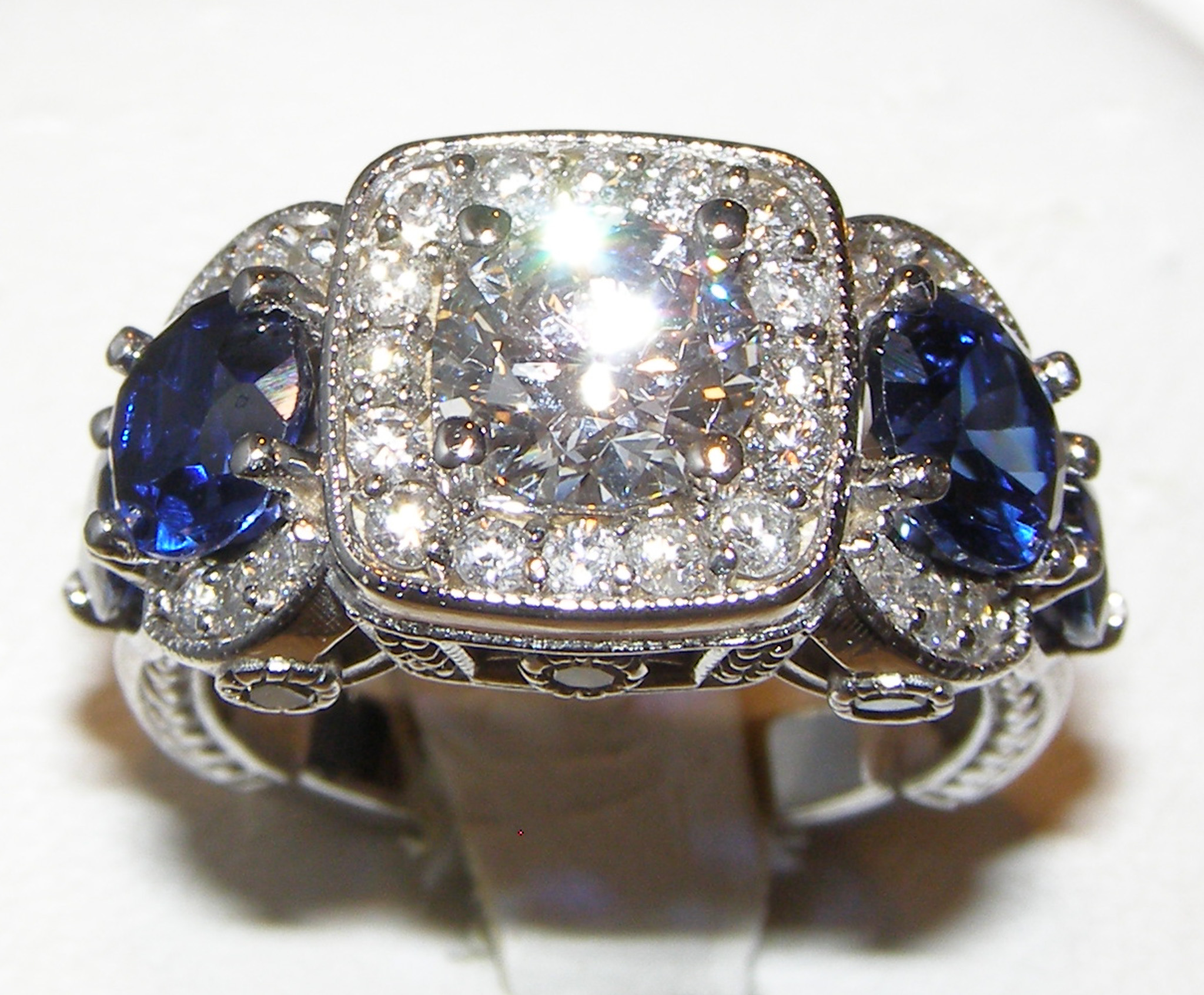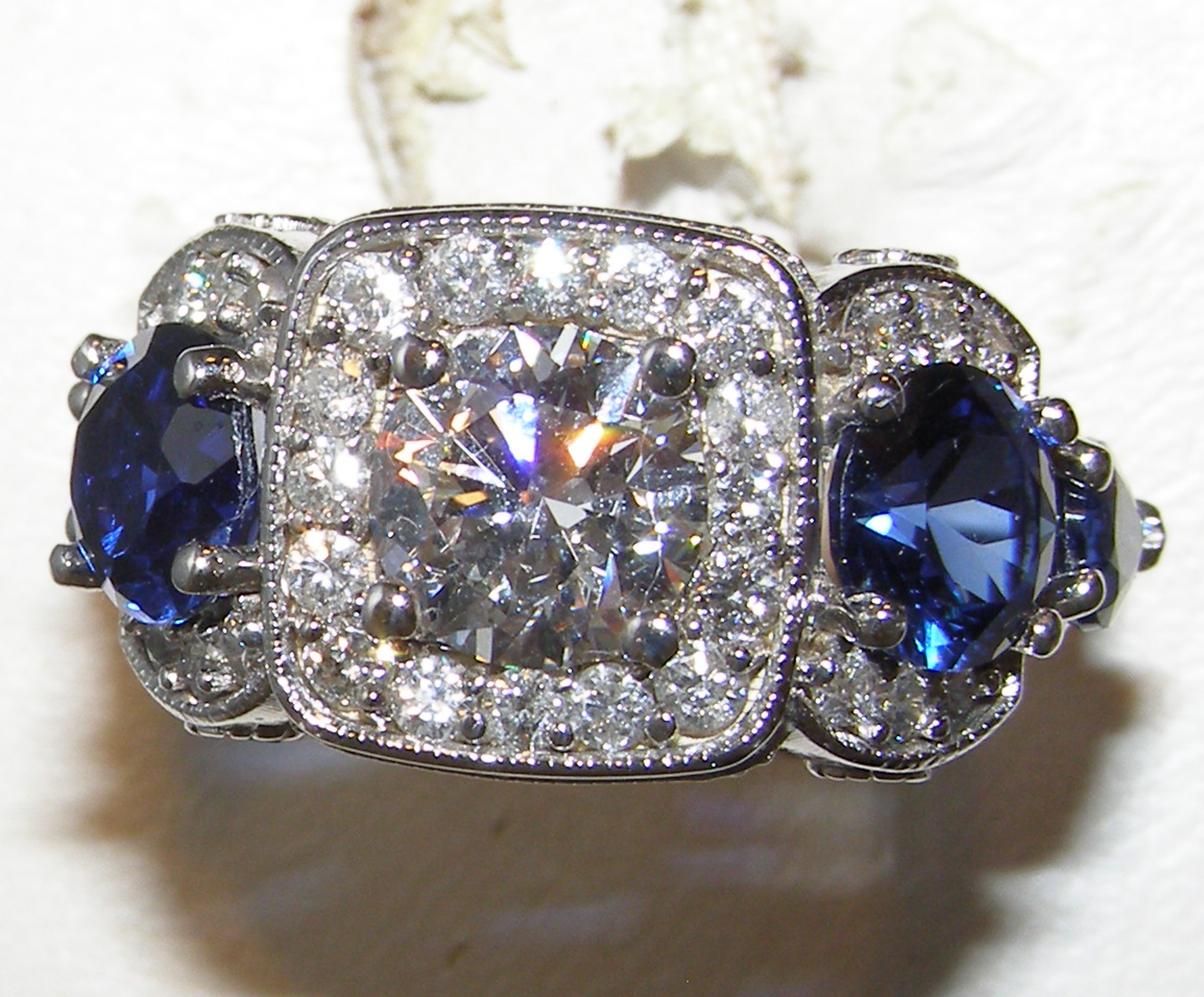 Lab diamonds have become very popular due to their ethical sourcing and sustainability. Featured in this ring is a GCAL 8x certified laboratory grown diamond. This brand of diamond, 8X® Lab-Grown Diamonds, is awarded the highest achievement in precision diamond cutting. Recognized for their extraordinary brilliance and beauty, these lab-grown diamonds are meticulously analyzed and ultimately certified to be physically and optically excellent in eight critical factors of cut quality. The diamond is center prong set, weighs 1.08 carats, measures 6.58 mm, is rated excellent on all diamond criteria and is VS1 E quality. The ring is comprised of 3.20 ctw of Ceylon blue sapphires that include 2 round sapphires (2.10 ctw) and 2 pear cut sapphires (1.10 ctw) and 1.00 ctw in natural diamonds that are SI2 H qualtity. This is a substantial ring with 9.30 grams of platinum, measures 11.30 mm wide and is a size 61/2. Please indicate your sizing preference on the order form.