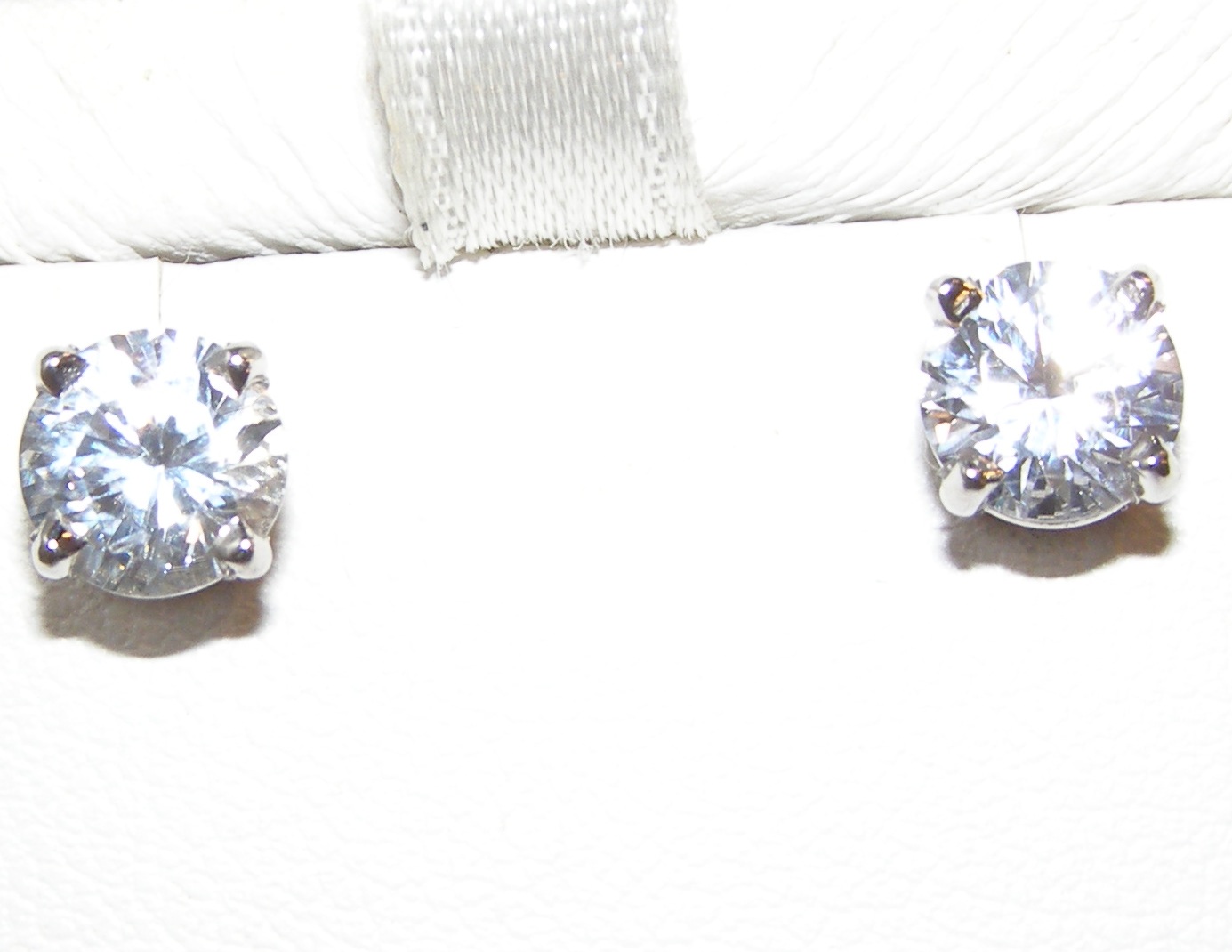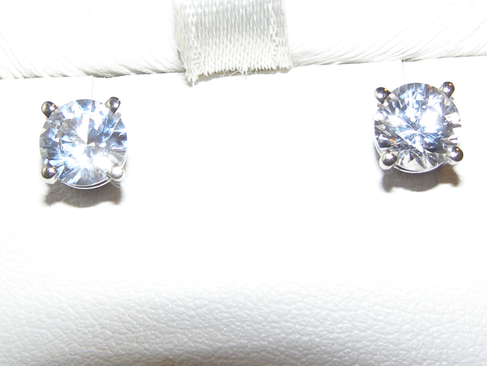 This is my last pair of 5.5 mm round brilliant white sapphires. Many have sold over the years! This pair measures 5.5 and 5.3 mm, weighs 1.10 ctw and displays a pure white color that is void of secondary hues. They are expertly faceted, have excellent clarity and dynamic white brilliance. I have a pair, that I wear frequently and love the flexibility of wearing them instead of of expensive diamond studs, They are four prong set in 14K white gold and have posts and push backs for pierced ears.